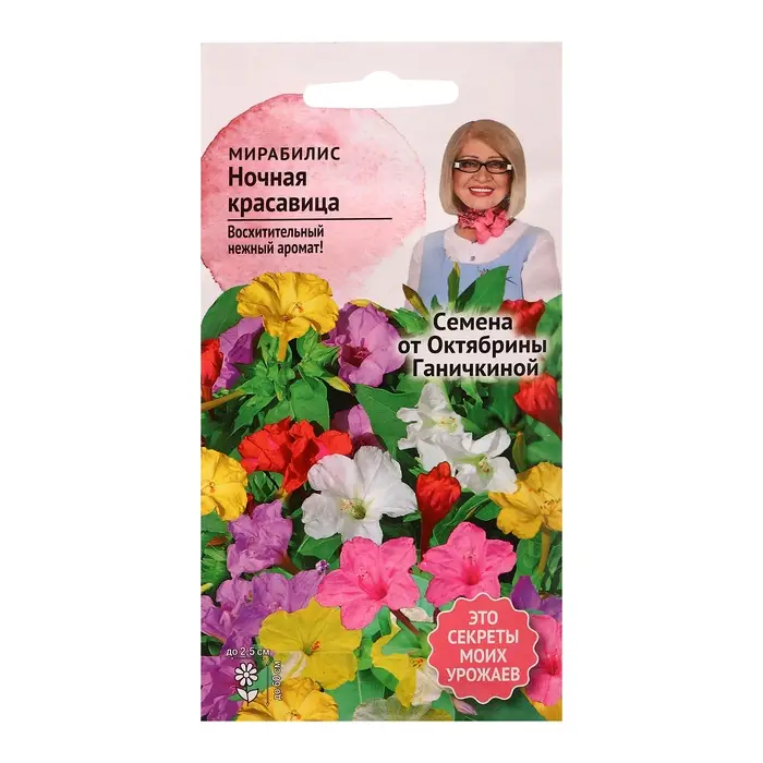 Многолетнее растение выращиваемое, как однолетнее. Прямостоячие, ветвистые стебли формируют округлые кустики высотой до 60 см. Цветки душистые, воронковидные, до 2,5 см в диаметре, ярких окрасок, собраны в щитковидные соцветия по 3-5 штук. На одном растении могут быть цветки различных окрасок, которые открываются в вечернее время и остаются раскрытыми до рассвета. Цветение длится с июля до заморозков. Мирабилис используют в смешанных цветниках, клумбах, рабатках. Агротехника: Мирабилис – свето- и теплолюбивое, засухоустойчивое растение, предпочитает суглинистые почвы. Семена высевают на рассаду в марте-апреле или в открытый грунт в мае. Глубина посева 1-1,5 см. Перед посевом семена замачивают на 4-6 часов. На постоянное место высаживают в конце мая - июне, когда минует угроза заморозков. Схема посадки 20×25 см. Уход заключается в рыхлении, своевременных поливах и подкормках. Штрих-код - 4650091480326