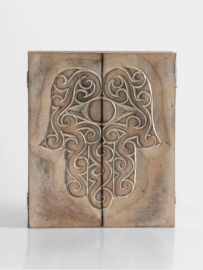 Шкатулка «Хамса» — вместительная бежевая коробочка с символом защиты и гармонии. Её крупный формат и выгравированная ладонь хамсы превращают хранение украшений в осознанный ритуал: не просто убрать, а поместить в пространство, где забота и энергия — часть повседневности. Без покрытия, с матовой текстурой дерева, она выглядит скромно, но говорит уверенно.