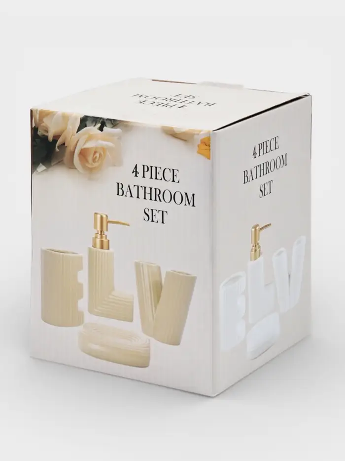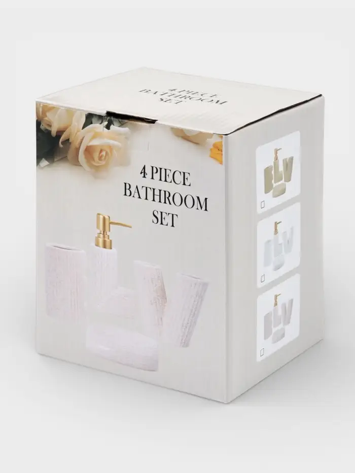 Полный керамический набор для ванной, который объединяет все необходимые аксессуары для поддержания порядка у раковины. Лаконичный белый комплект создает цельный и спокойный образ, превращая хаотичные мелочи в организованную систему.