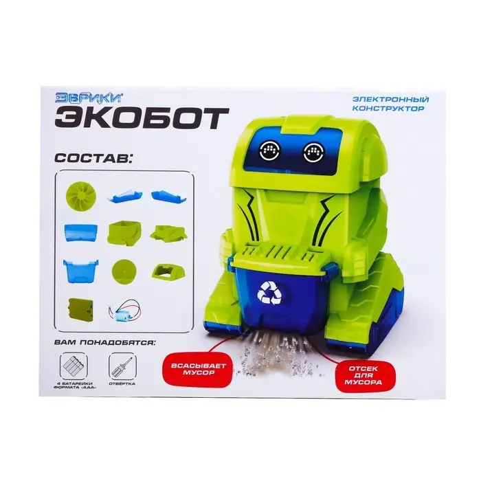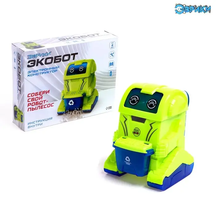 С помощью набора для опытов «Эврики» ребёнок соберёт робот-пылесос. «Экобот» умеет всасывать мусор и имеет отсек, куда его собирает.