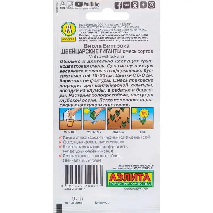 Семена цветов Виола "Швейцарские гиганты", ц/п, виттрока, 0,05 г