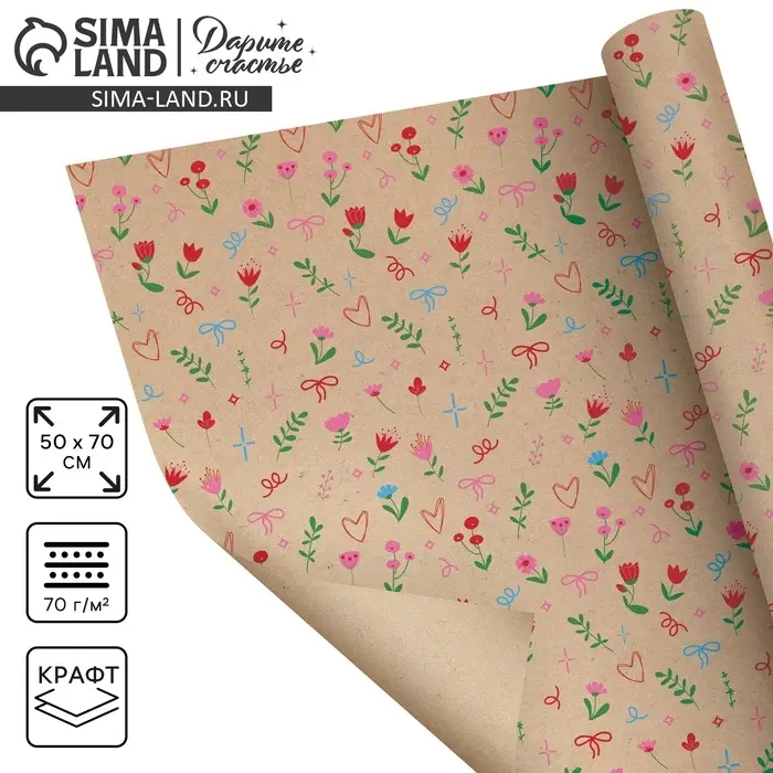 Бумага упаковочная крафтовая «Векторные цветы», 50 × 70 см