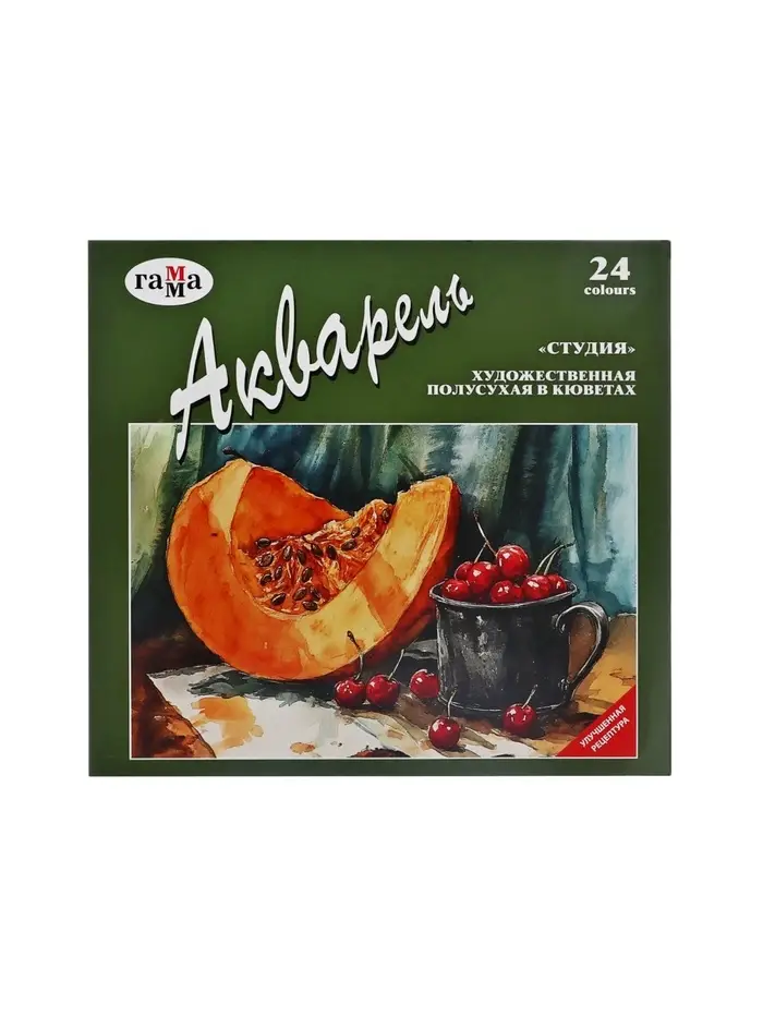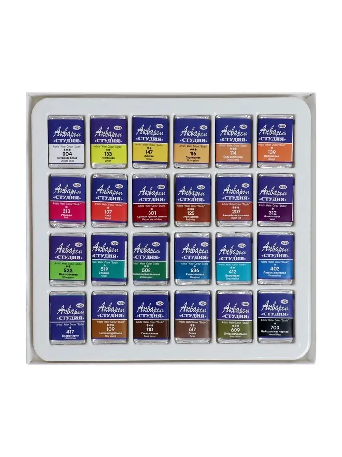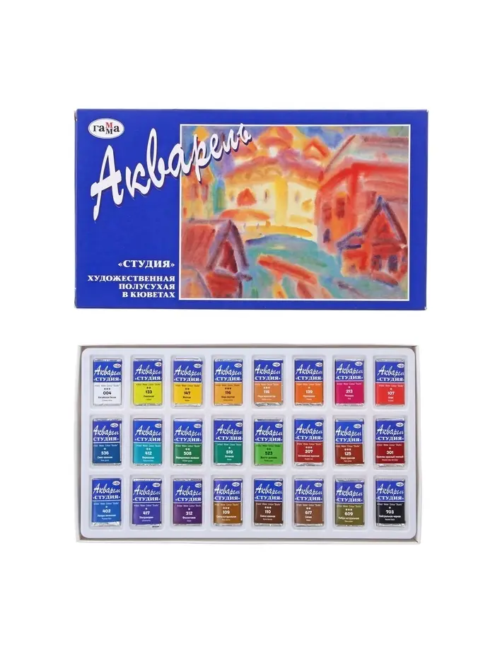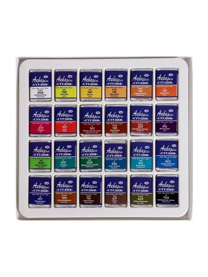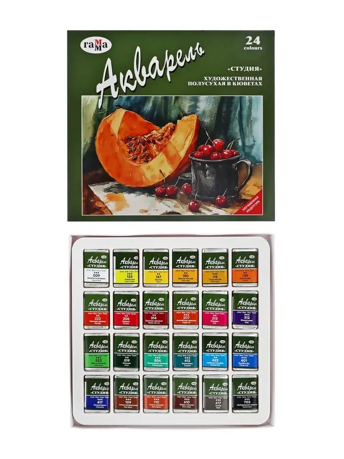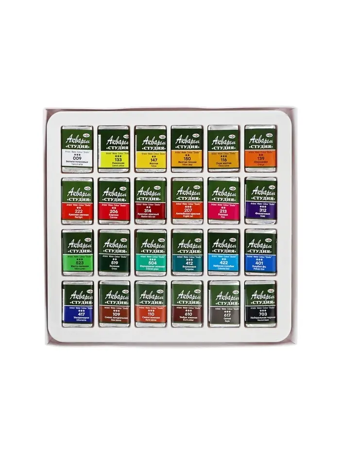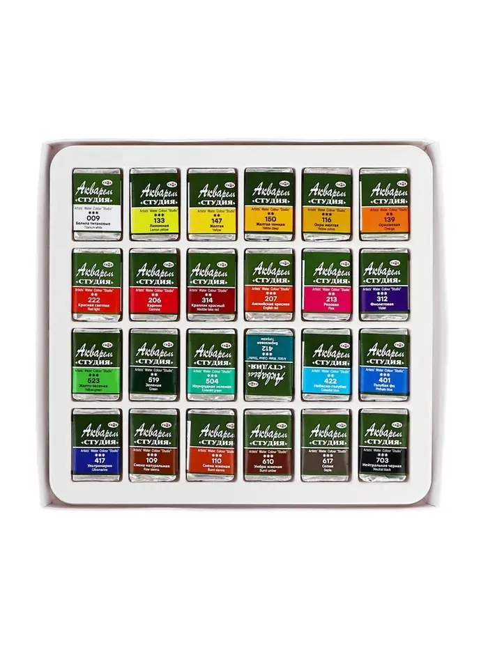 Акварельные краски серии «Студия» изготовлены на основе гуммиарабика. Полусухая акварель сушится при температуре не выше 40 °C , что позволяет сохранить яркость и свежесть краски. После высыхания она становится матовой. Цвета легко смешиваются между собой, прекрасно размываются и легко набираются из кюветы. Набор из 24 цветов акварельных красок идеально подойдёт для начинающих художников и студентов художественных училищ.