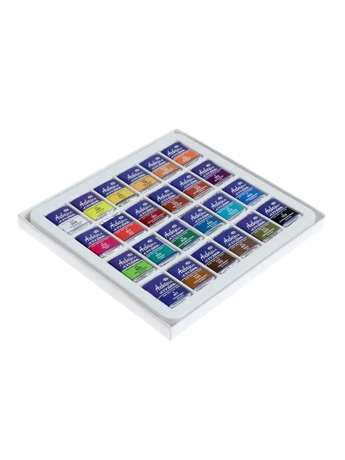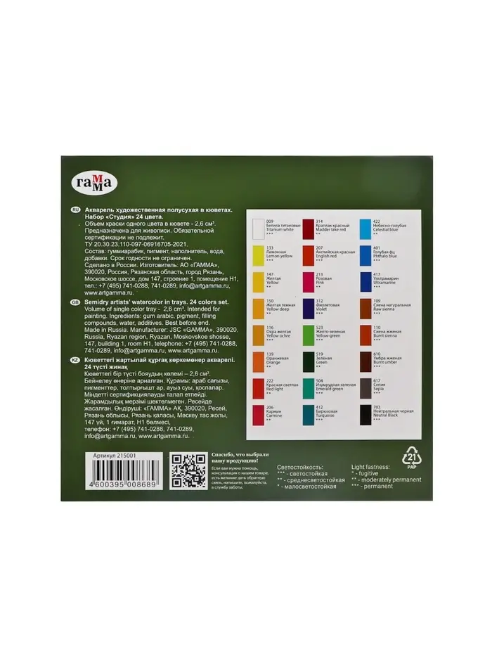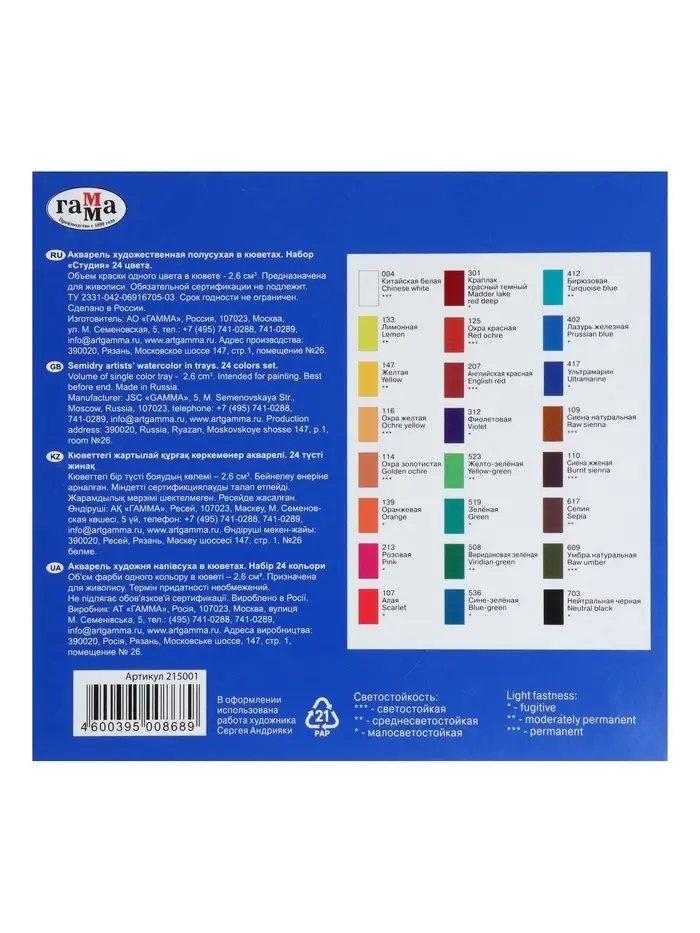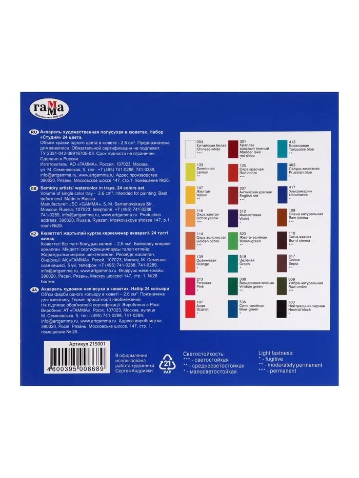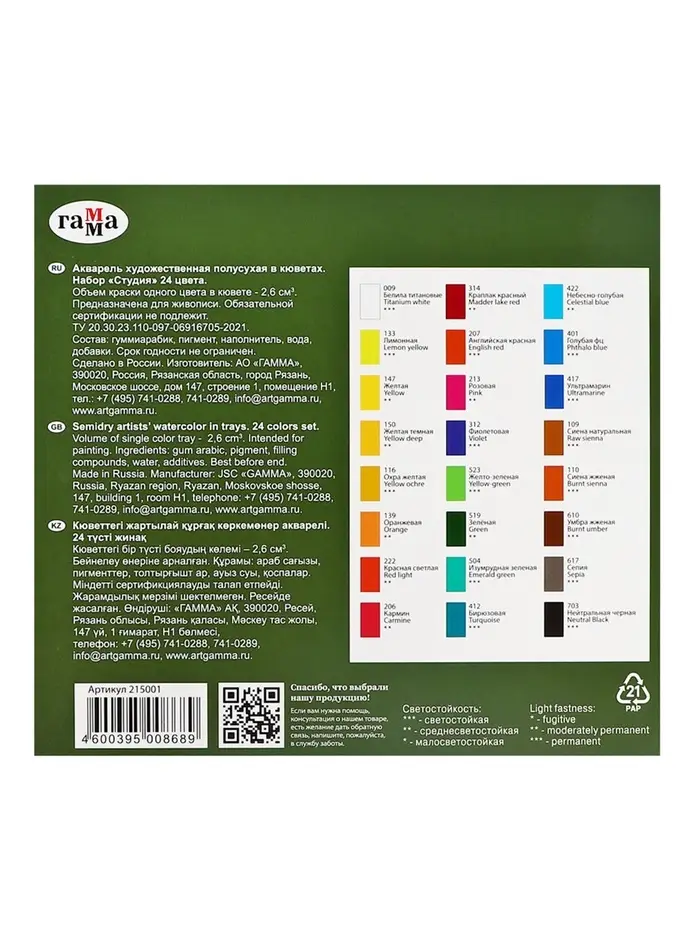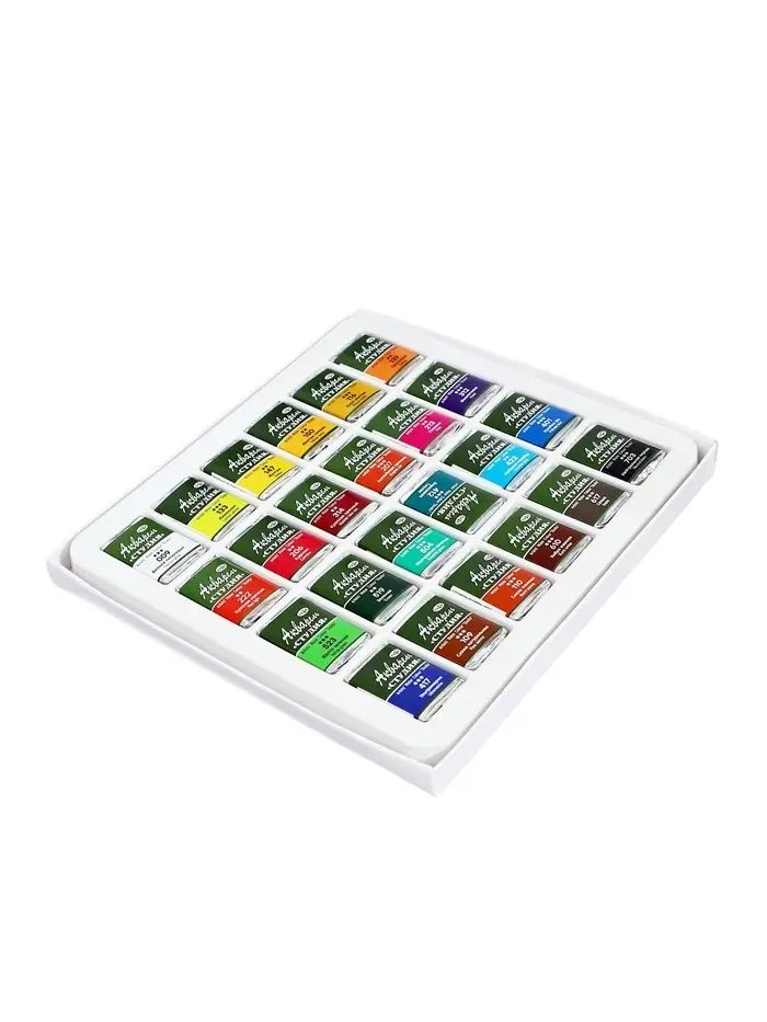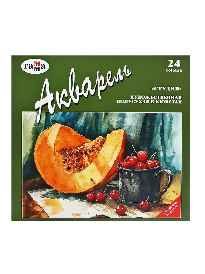 Акварельные краски серии «Студия» изготовлены на основе гуммиарабика. Полусухая акварель сушится при температуре не выше 40 °C , что позволяет сохранить яркость и свежесть краски. После высыхания она становится матовой. Цвета легко смешиваются между собой, прекрасно размываются и легко набираются из кюветы. Набор из 24 цветов акварельных красок идеально подойдёт для начинающих художников и студентов художественных училищ.