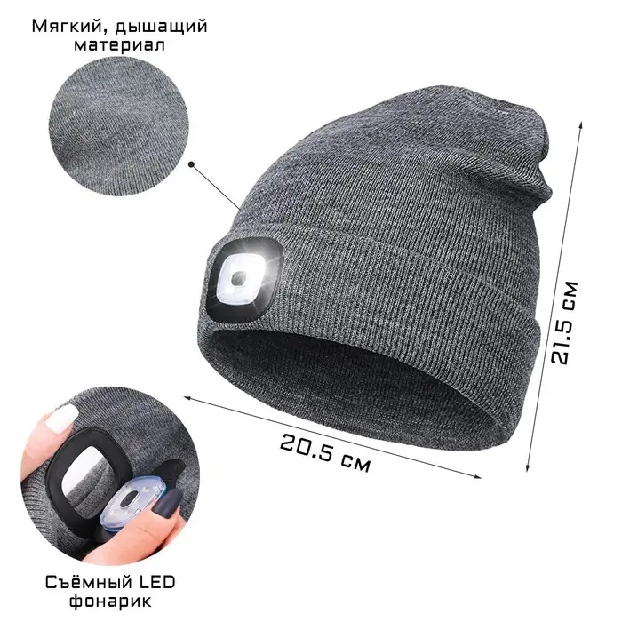 Теплая и удобная шапка оснащена съемными четырьмя LED — фонариками, что делает ее идеальным выбором для активного отдыха в условиях низкой освещенности. Благодаря этому аксессуару вы можете выполнять любые задачи даже в полной темноте, оставаясь при этом хорошо заметными на улицах и дорогах.