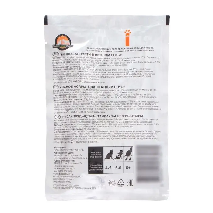 Влажный корм "Puffins" для кошек, мясное ассорти в соусе, 75 г