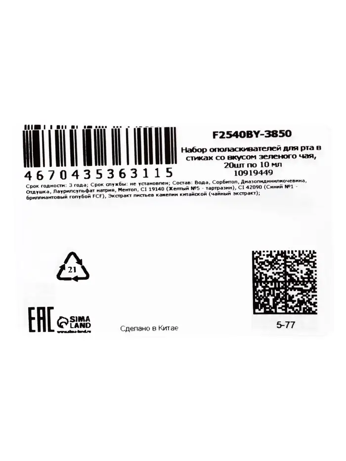 Ополаскиватель для полости рта в стиках со вкусом зеленого чая, 20 шт. по 10 мл