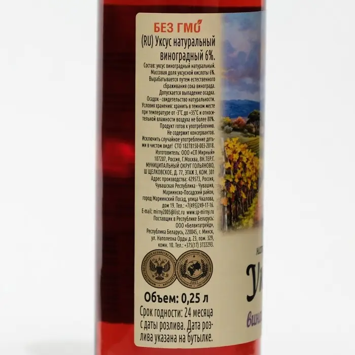 Состав: уксус виноградный натуральный. Массовая доля уксусной кислоты 6%. Вырабатывается путем естественного сбраживания сока винограда. Допускается выпадение осадка. Осадок - свидетельство натуральности.