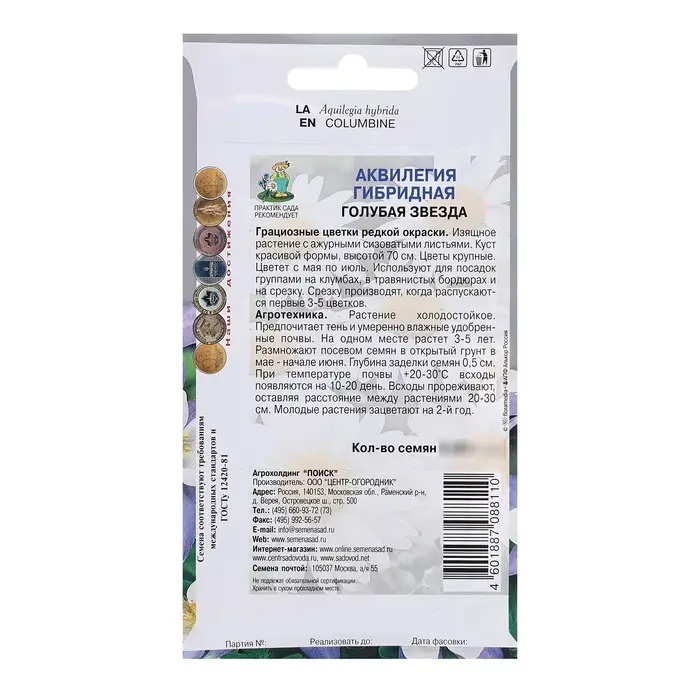 Грациозные цветки редкой окраски. Изящное растение с ажурными сизоватыми листьями. Куст красивой формы, высотой 70 см. Цветы крупные. Цветет с мая по июль. Используют для посадок группами на клумбах, в травянистых бордюрах и на срезку. Срезку производят, когда распускаются первые 3-5 цветков.Агротехника. Растение холодостойкое. Предпочитает тень и умеренно влажные удобренные почвы. На одном месте растет 3-5 лет. Размножают посевом семян в открытый грунт в мае – начале июня. Глубина заделки семян 0,5 см. При температуре почвы +18°C всходы появляются на 20-30 день. Всходы прореживают, оставляя расстояние между растениями 20-30 см. Молодые растения зацветают на 2-й год.Семена соответствуют требованиям международных стандартов и ГОСТу РФ 12420-81
