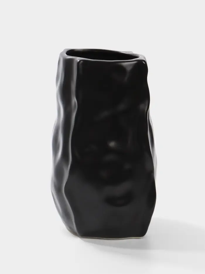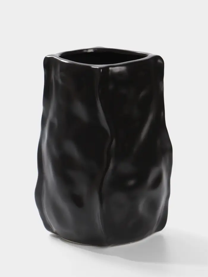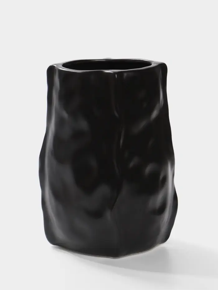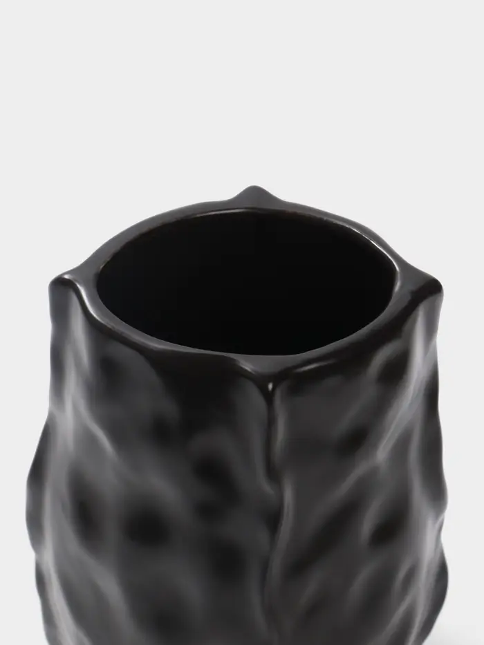 Эта настольная керамическая ваза — строгий акцент для современного интерьера. Её глубокий чёрный цвет и тактильный рельеф создают игру света и тени, добавляя пространству графичности и глубины. Идеальный формат для сухоцветов, одиночных стеблей или минималистичных композиций.