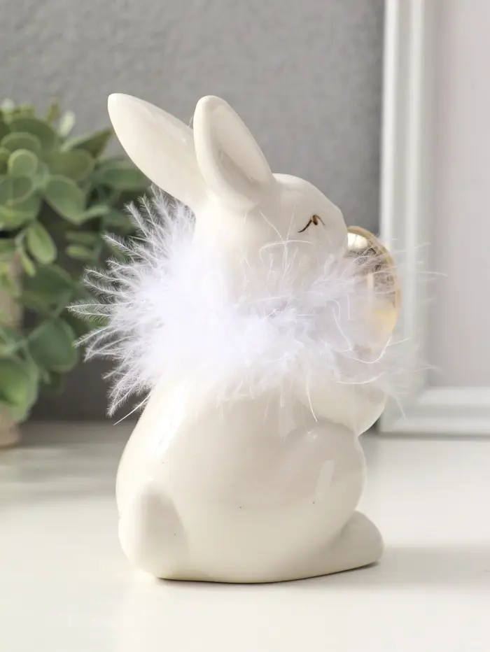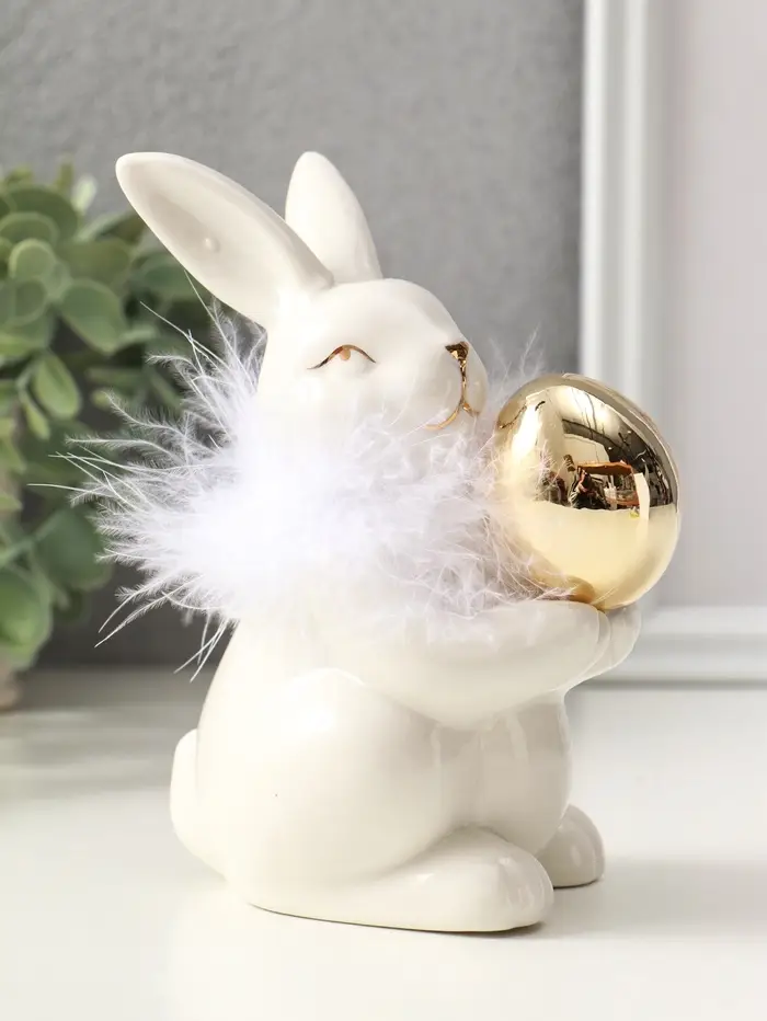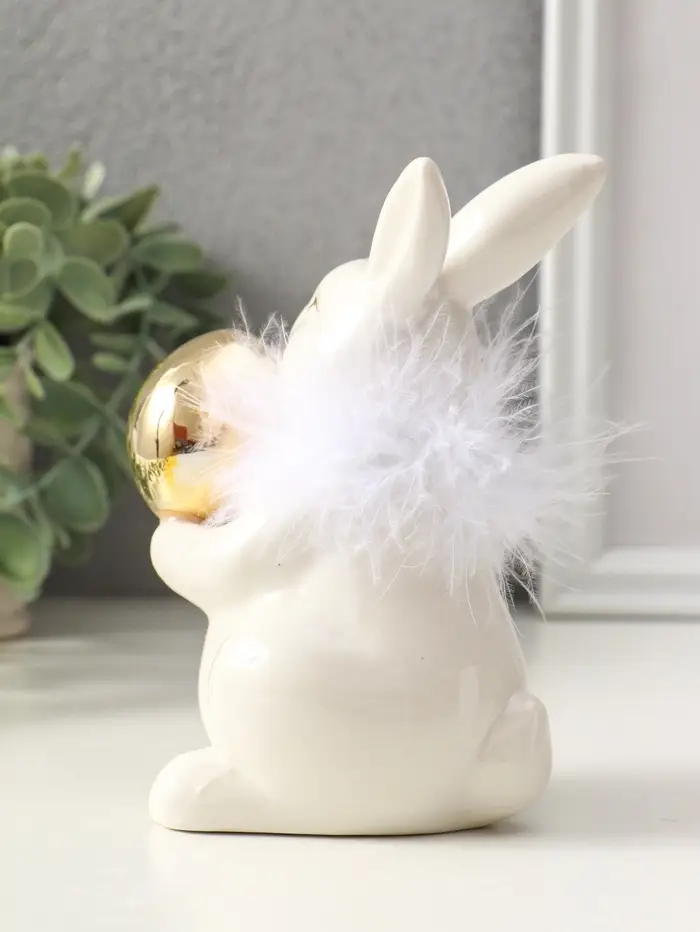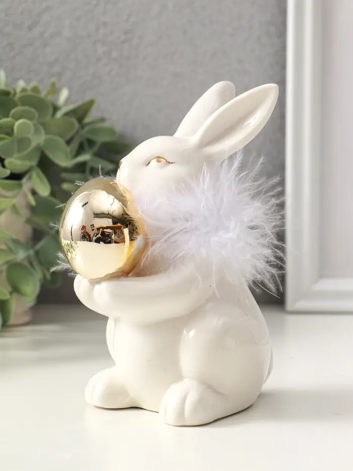 Сувенир керамика, пух "Зайка с золотым пасхальным яичком" белый 8х10,5х14 см