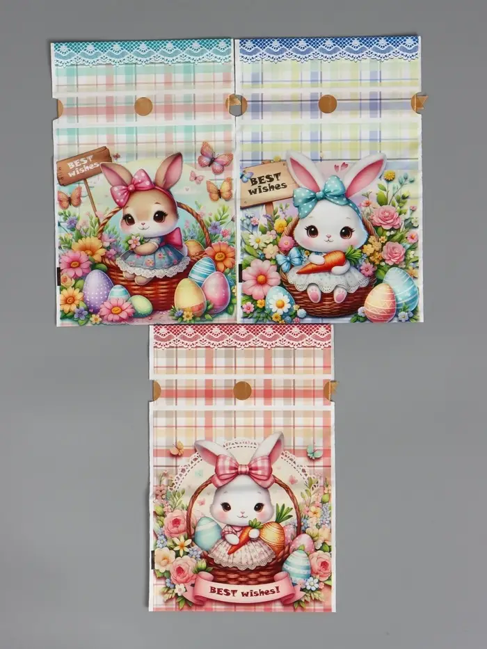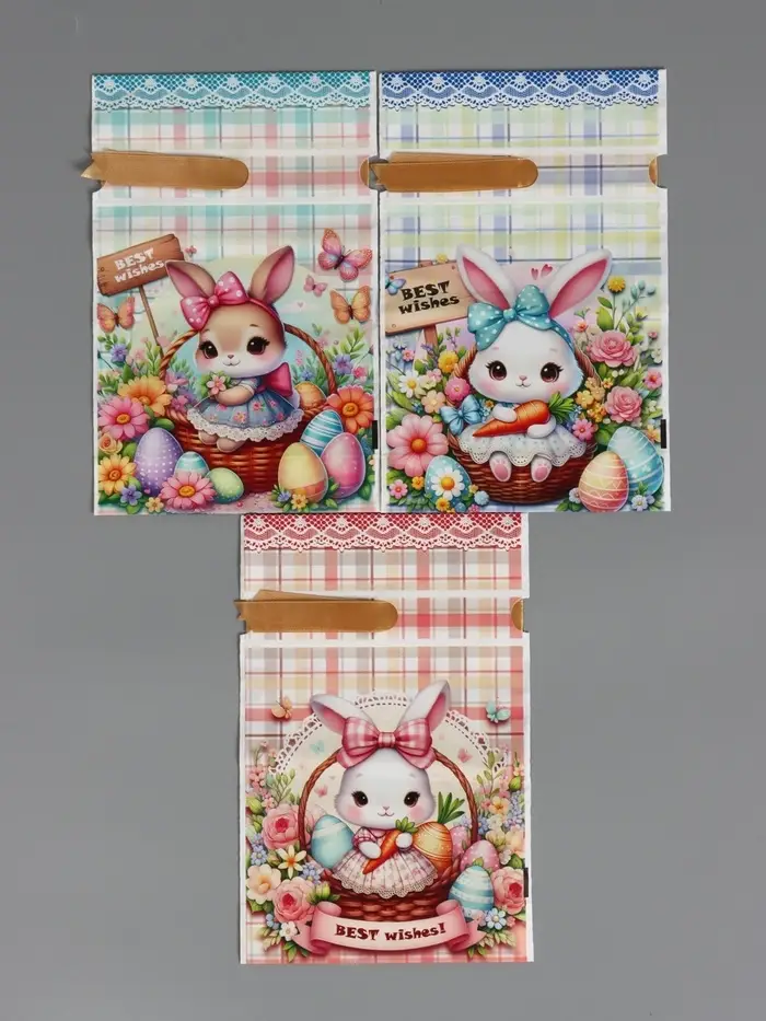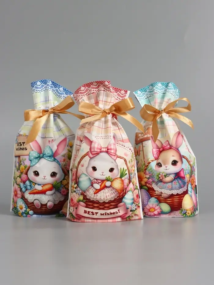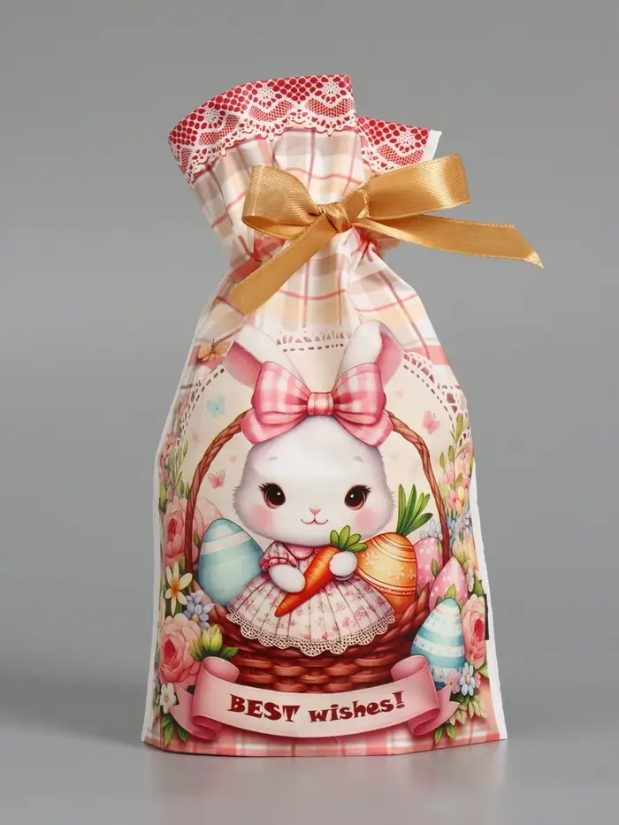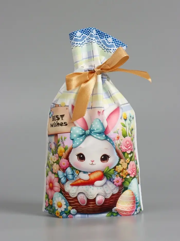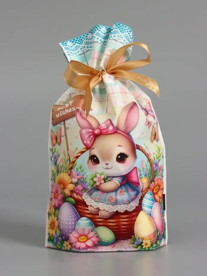 Пакет полиэтиленовый подарочный "Заяц с цветами", с завязками, 15х23±1 см