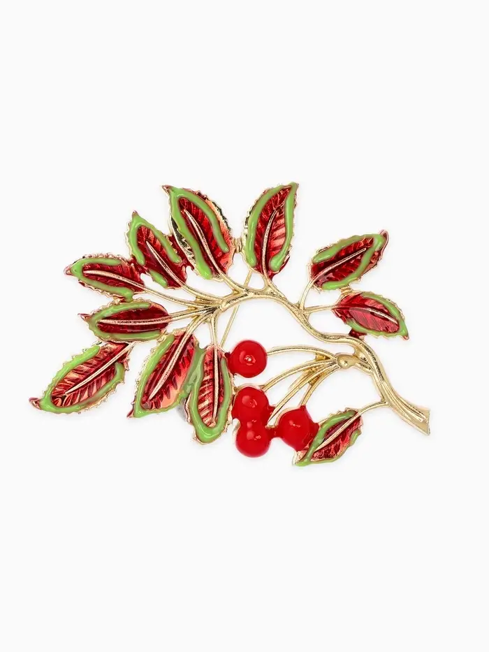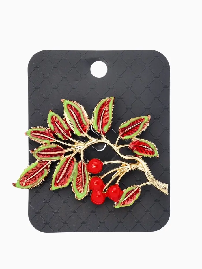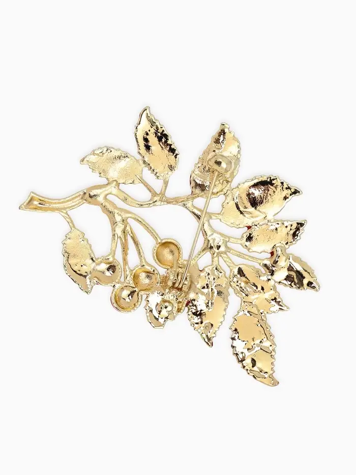 Брошь «Вишня», с листочками, красно-зелёная в золоте