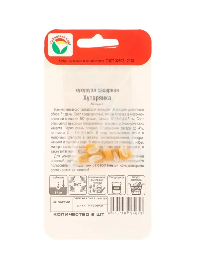Семена Кукуруза сахарная «Хуторянка», 6 шт., «Сибирский сад»