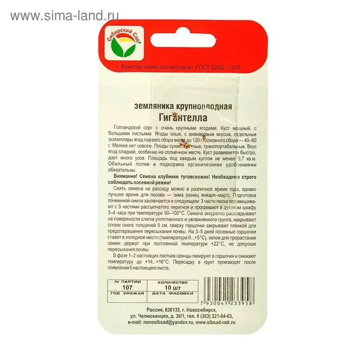 Голландский сорт с очень крупными ягодами.Куст мощный, с большими листьями. Ягоды алые, с ананасовым вкусом, отдельные экземпляры ягод первого сбора весят до 120 г, основного сбора — 40-60 г. Мелких нет совсем. Плоды сухие, плотные, транспортабельные. Вкус ягод сладкий, особенно на солнечном месте. Куст развивается быстро, дает много усов. Площадь под каждым кустом не менее 0,7 кв. м. Обильный полив и подкормка органическими удобрениями обязательны.Внимание! Семена клубники туговсхожие! Необходимо строго соблюдать посевной режим! Всходы чаще всего появляются неравномерно в течение 30-40 дней (до 60 дней).Сеять семена на рассаду можно в различное время года, однако лучшее время для посева - зима (конец января - март). Подготовка почвенной смеси заключается в следующем: 3 части песка перемешивают с 5 частями рассыпчатого перегноя и прогревают в духовом шкафу 3-4 часа при температуре 90-100°С. Семена аккуратно раскладывают на поверхности слегка уплотненного и увлажненного грунта, накрывают слоем снега толщиной 5 см, сверху горшочки закрывают пленкой для предотвращения пересыхания почвы. На 3-5 дней посевные горшочки ставят в холодное место (температура 0...+5°C), затем для прорастания семена держат при постоянной температуре +22°С, не допуская пересыхания почвы.В фазе 1 -2 настоящих листьев сеянцы пикируют в горшочки и снижают температуру до +14...+16°С. Пересадку в грунт производят после появления 6-го настоящего листа.