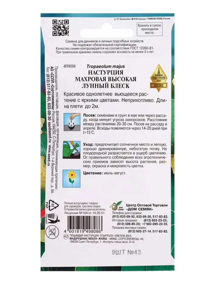 Семена цветов Настурция махровая высокая "Лунный Блеск" Дом семян, О, 9 шт