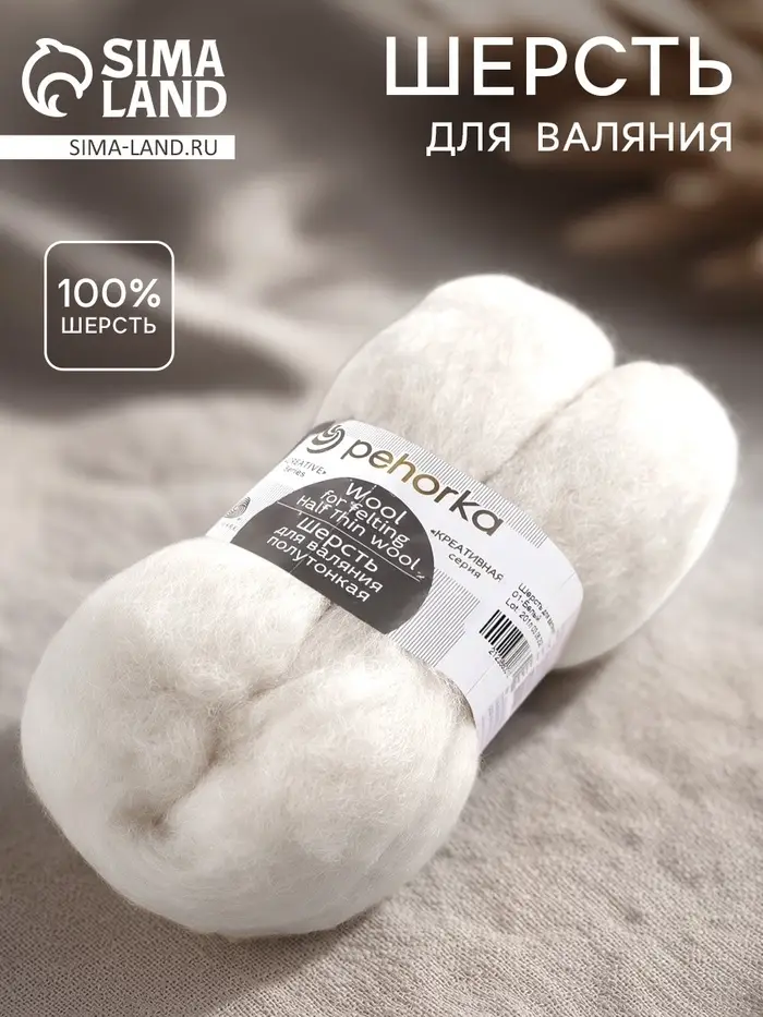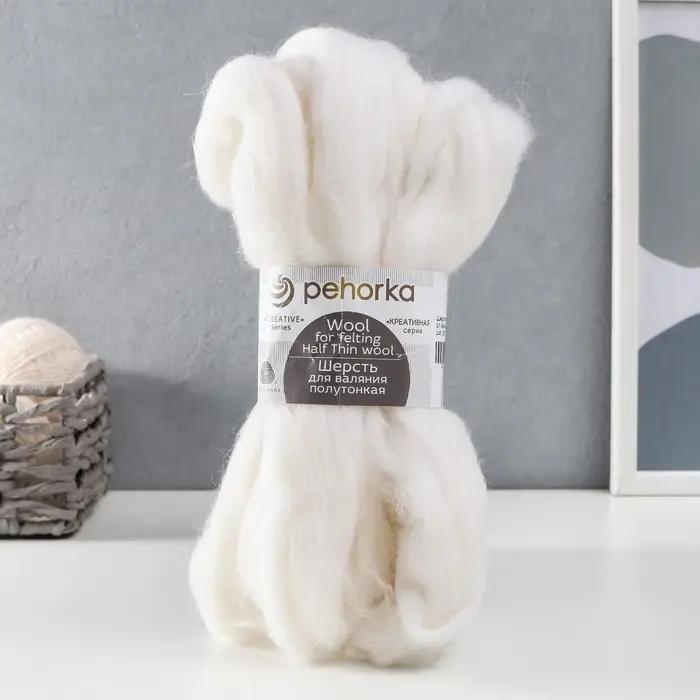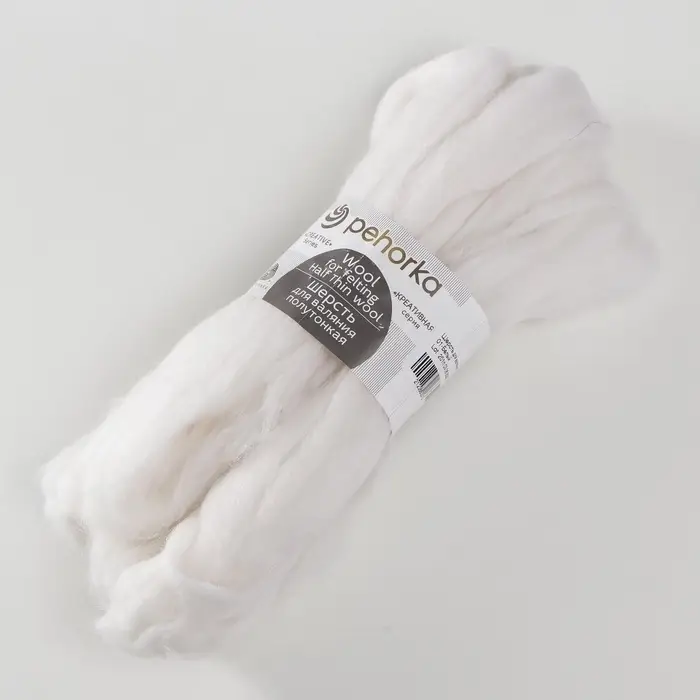 Шерсть для валяния 100% полутонкая шерсть 50гр (01 белый)