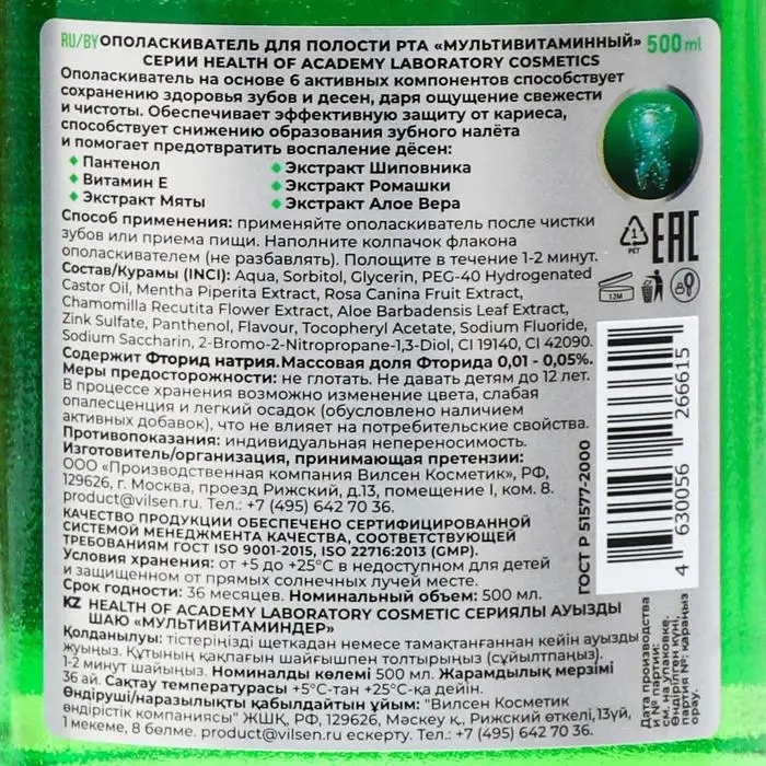Ополаскиватель для полости рта Vilsendent «Мультивитаминный», цвет зелёный, 500 мл