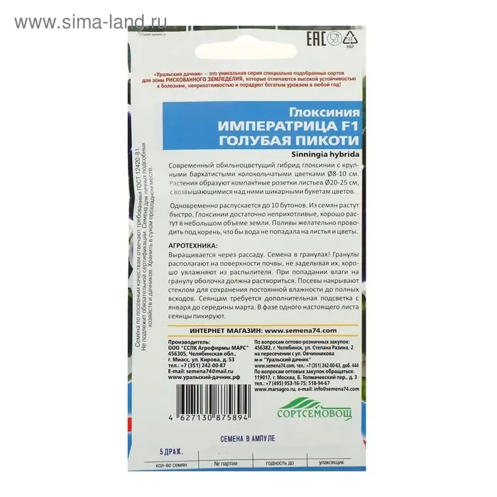 Семена цветов Глоксиния "Императрица", "Голубая Пикоти" , F1, 5 шт.