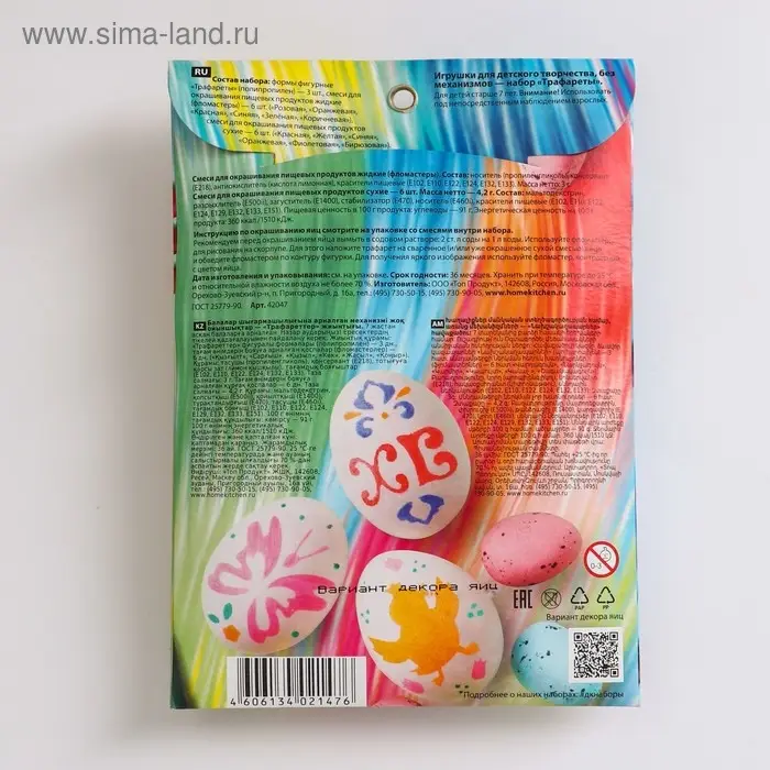 В этом наборе есть всё, чтобы сделать подготовку к пасхе весёлой и запоминающейся для всей семьи! Здесь представлены яркие красители, трафареты для нанесения рисунков и пищевые фломастеры, с помощью которых можно расписать яйца ярко и оригинально.