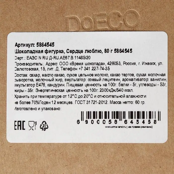 Шоколадная фигурка «Сердце с надписью», 80 г