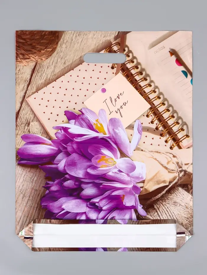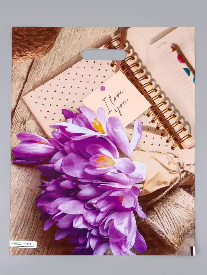 - Сезонный дизайн с цветочной темой: Крокусы как символ ранней весны делают пакет особенно актуальным для подарка на 8 Марта. Неброский бежевый фон и изящный шрифт надписи добавляют утончённости.