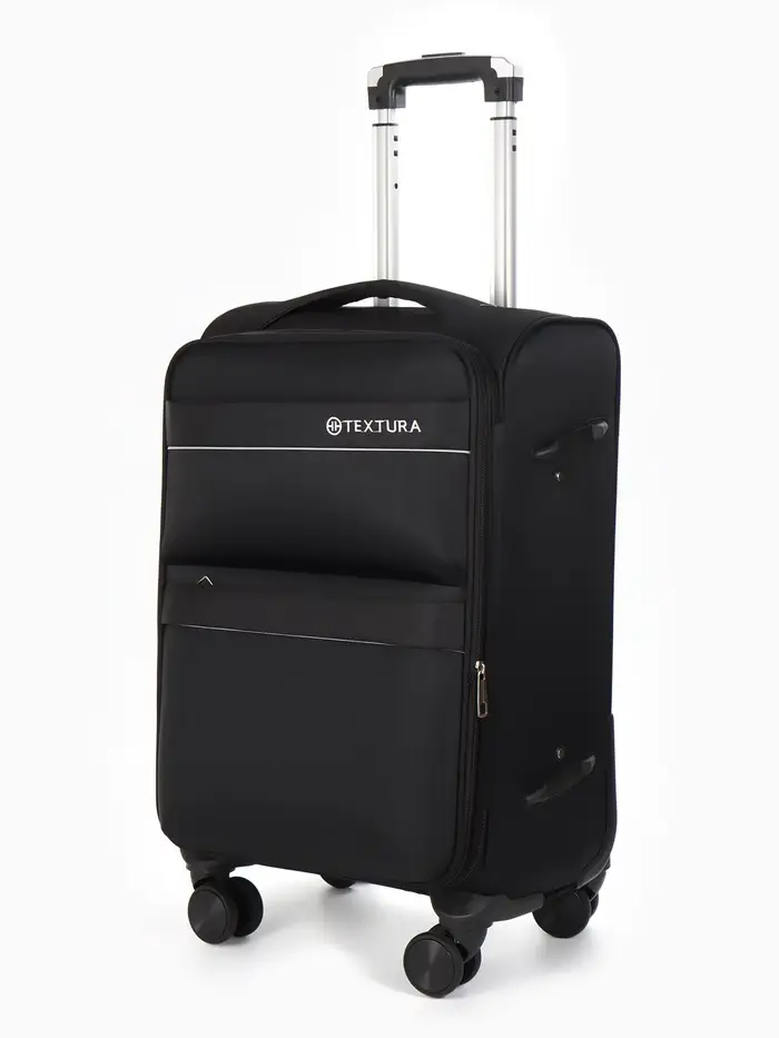 Чемодан 20",Текст,36*25*58,отд на молнии,2 нар/карм, увелич,код замок,4 колеса, черный