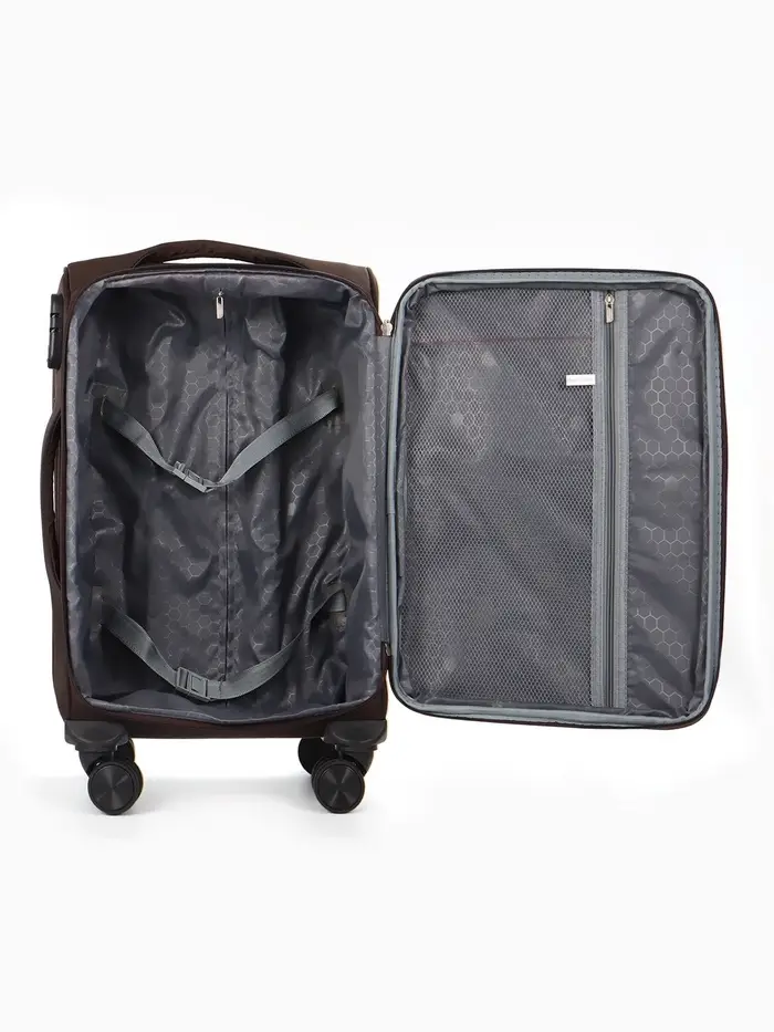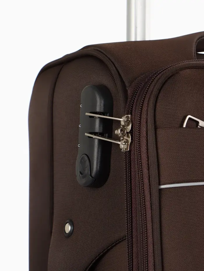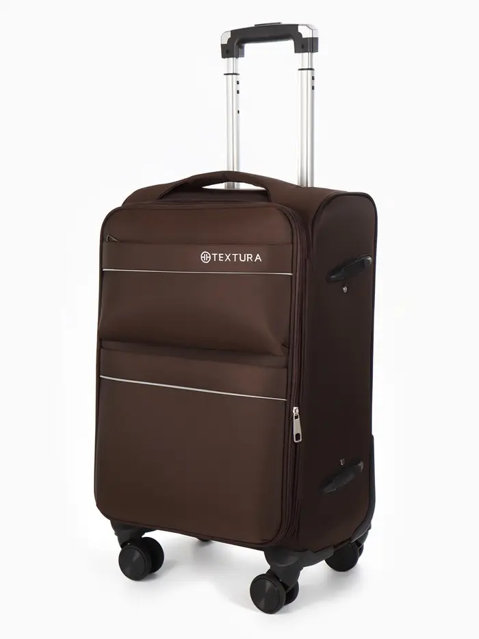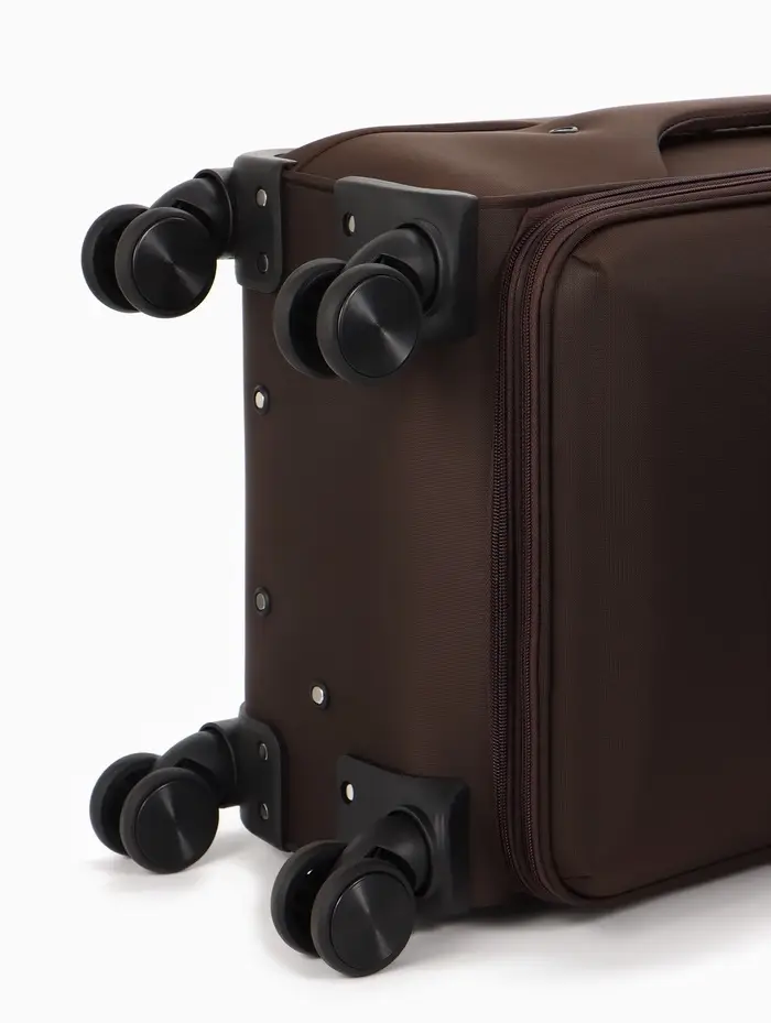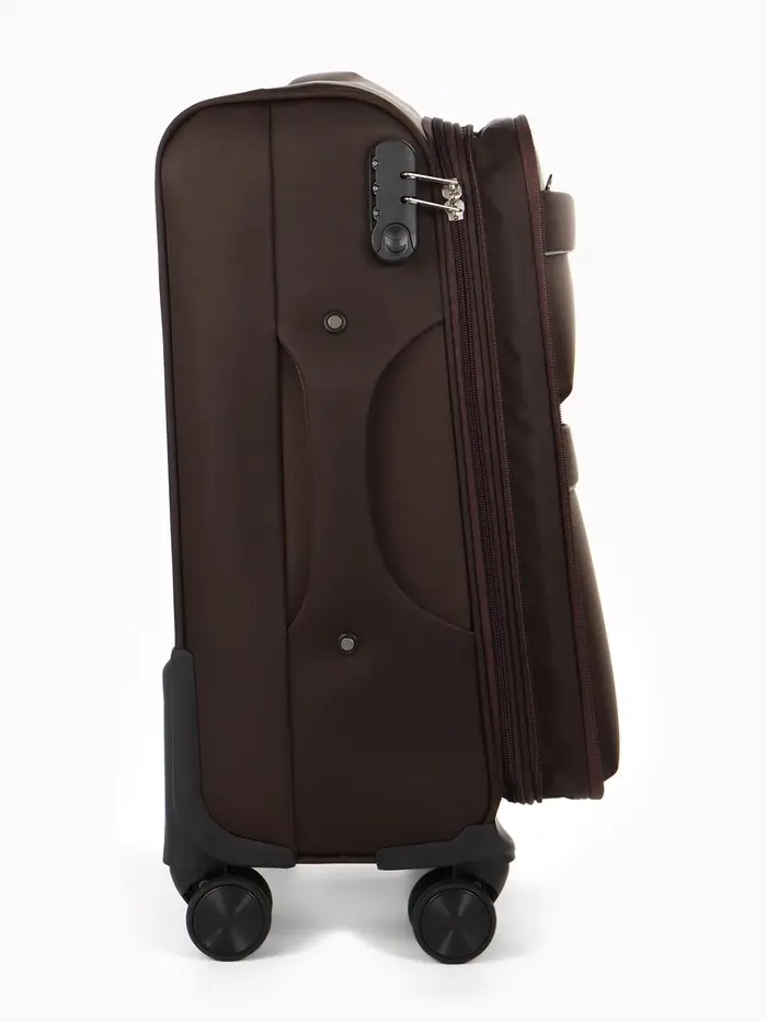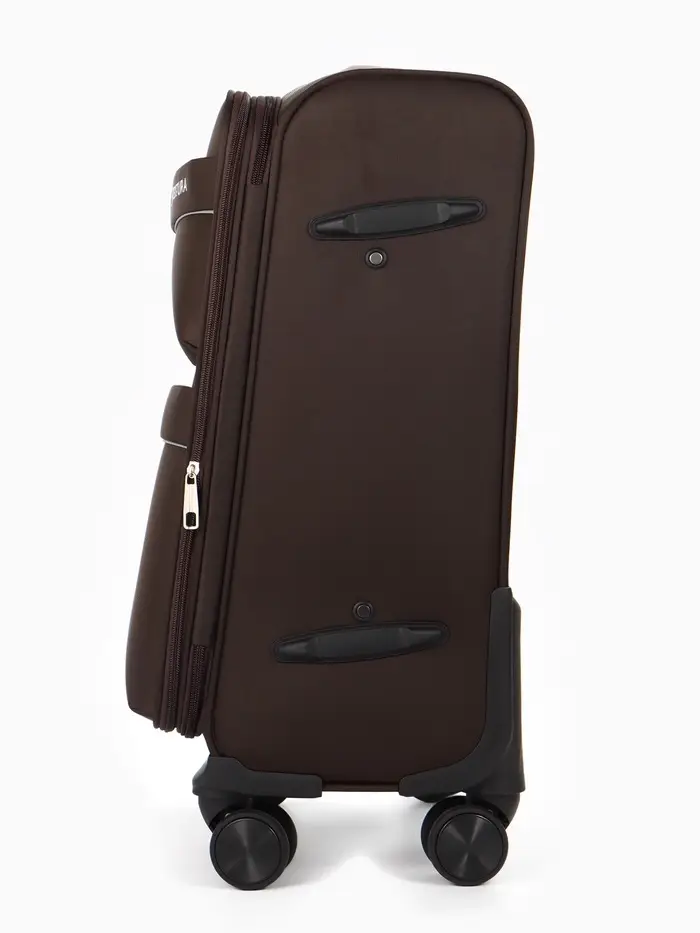Этот коричневый чемодан на колёсах — ваш надёжный спутник в любых поездках. Модель формата 20 дюймов с увеличенным объёмом сочетает компактные габариты для ручной клади с практичной вместительностью. Четыре поворотных колеса обеспечивают манёвренность в аэропортах и на вокзалах, а прочный текстиль корпуса надёжно защищает вещи.