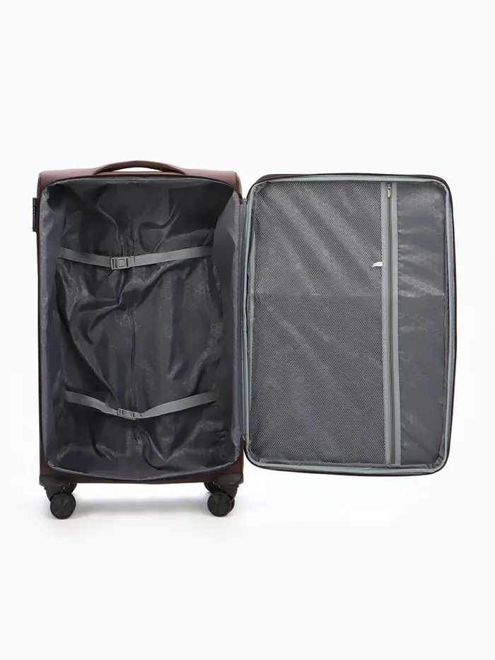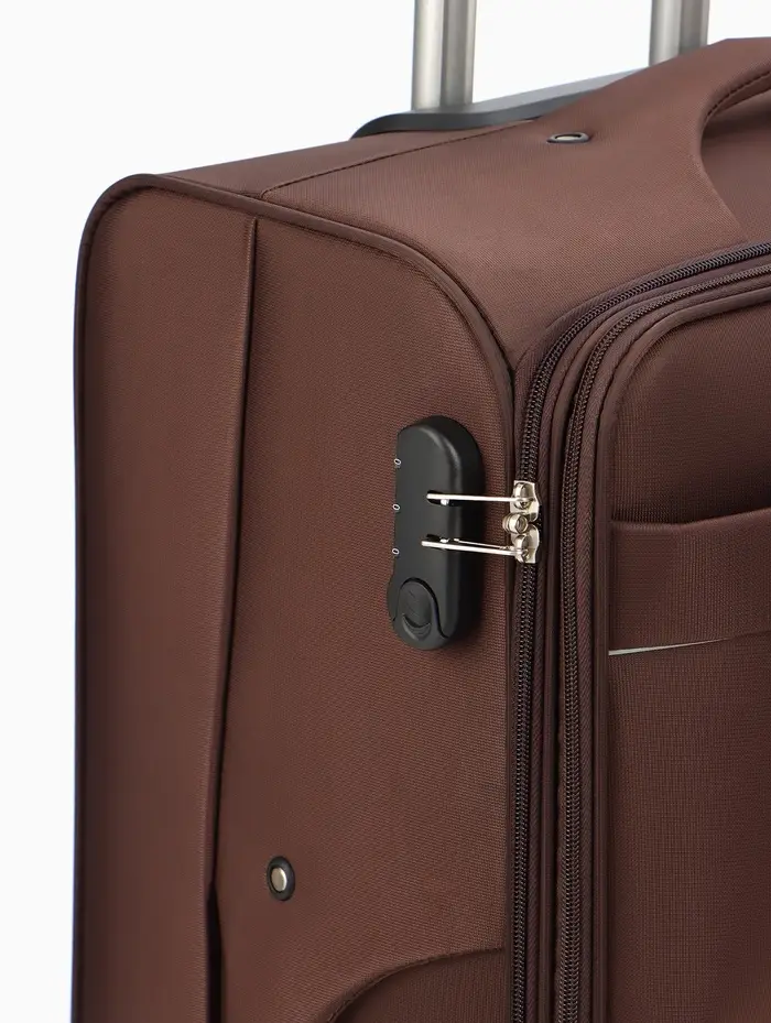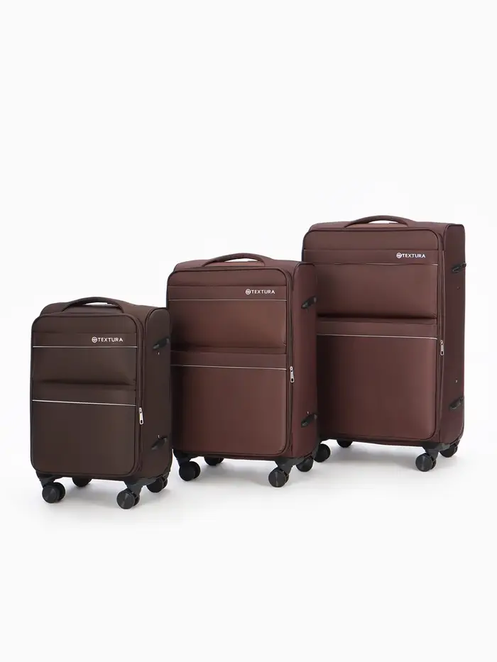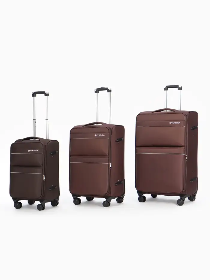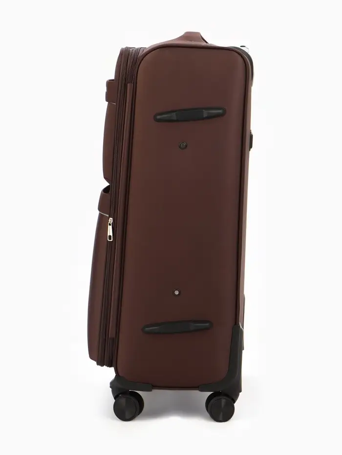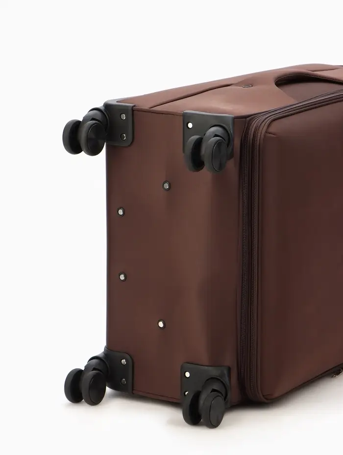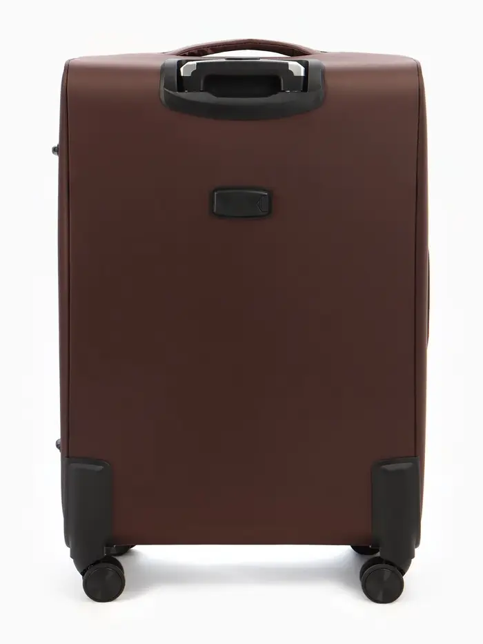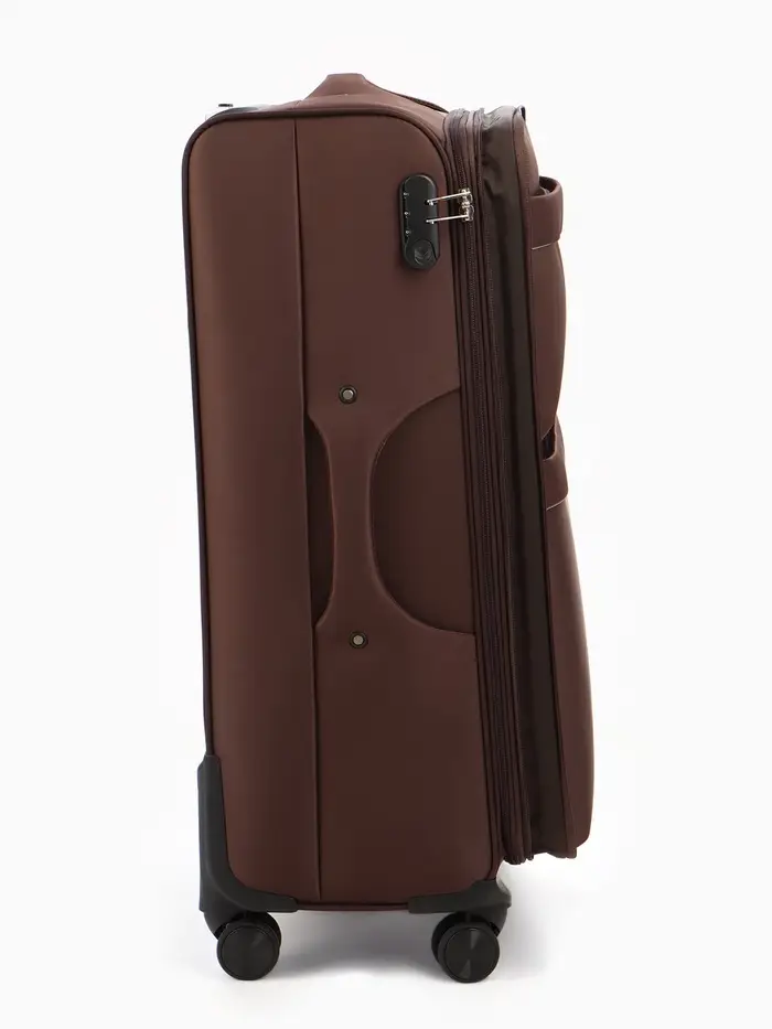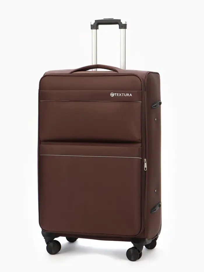 Этот коричневый дорожный чемодан на четырёх колёсах — ваш надёжный спутник в любых поездках. Его текстильная фактура сочетает стильный вид с практичной прочностью, а продуманная конструкция делает путешествие по-настоящему лёгким.