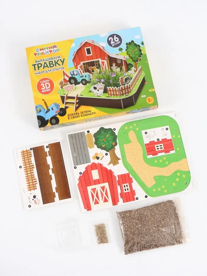 - Игровой формат обучения: Знакомый персонаж Синий трактор мотивирует довести начатое до конца. Тематические аксессуары превращают емкость с растениями в пространство для сюжетных игр, где развитие воображения идет рука об руку с получением полезных навыков.