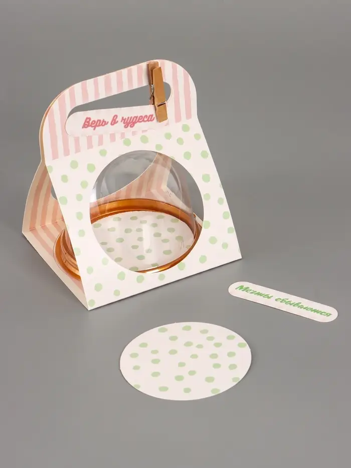 Игривая свежесть в стильной упаковке. Коробочка-купол «Горошек мятный» — это легкая и современная упаковка с игривым принтом. Сочетание мятного горошка на белом фоне и прозрачного колпака создает образ весенней легкости и хорошего настроения.
