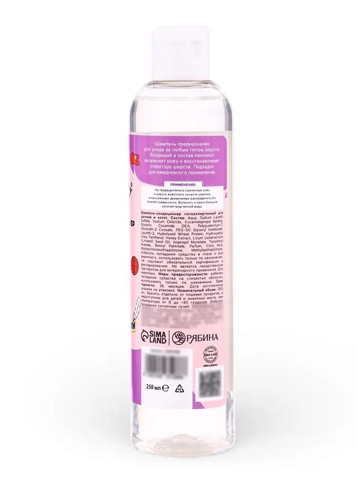 - Кондиционирующий эффект: мягкие катионные компоненты обволакивают волос, снижая статику и спутывание — особенно важно для длинношёрстных пород в период смены пушкового покрова. Шерсть остаётся подвижной, без эффекта «налёта» или утяжеления.