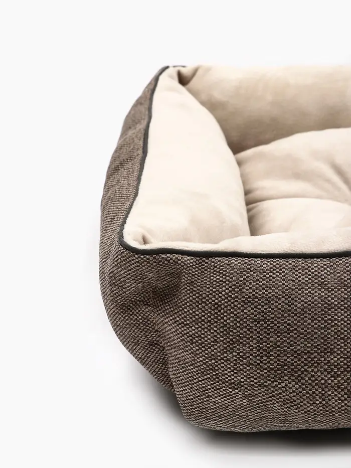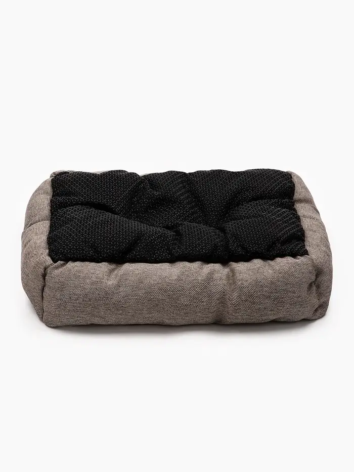 - Текстура без вычурности: материал не скользит по полу, не электризуется и не собирает шерсть в комки. При этом он сохраняет форму: лежанка не «садится» через неделю использования.