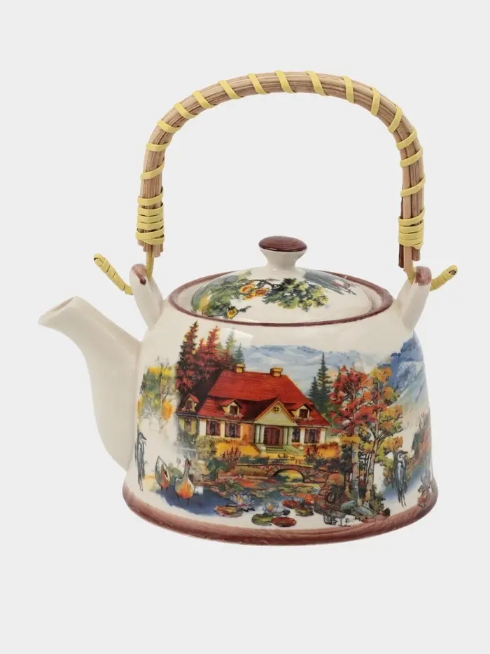 Пейзаж на этом чайнике не пытается перекричать интерьер — он дополняет его. Взгляд цепляется за детали: избушку, дерево, тропинку… и на мгновение городская суета отступает. Керамика мягко удерживает тепло, а чай заваривается ровно так, как задумал производитель. Этот чайник подойдёт тем, кто ищет в обыденных вещах отголоски детства, природы или ”тихого центра“ в круговерти дня.