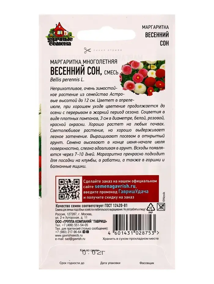Семена цветов Маргаритка Весенний сон* 0,02 г Уд. с.