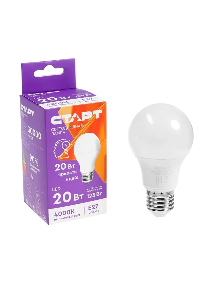 Лампа светодиодная СТАРТ, 20 Вт, Е27, 4000К, 1600 лм, свечение нейтральное белое