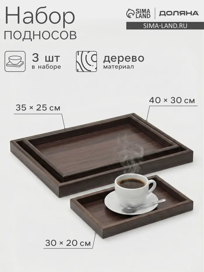 Подносы Доляна, набор 3 шт., 40×30 см, 35×25 см, 30×20 см, дерево, коричневые