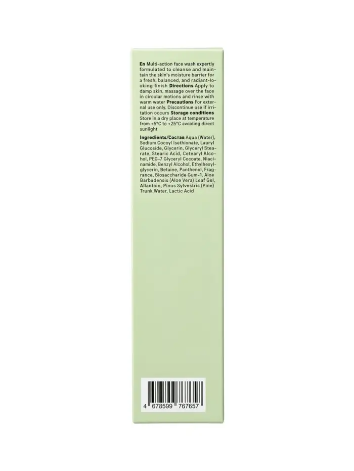Вода, кокоил изотионат натрия, лаурил глюкозид, глицерин, ПЭГ-7 глицерил кокоат, глицерил стеарат, стеариновая кислота, ниацинамид, бензиловый спирт, этилгексилглицерин, экстракт сосны, гель алоэ вера, пантенол, аллантоин, молочная кислота, биосахаридная смола, цетеариловый спирт, отдушка.