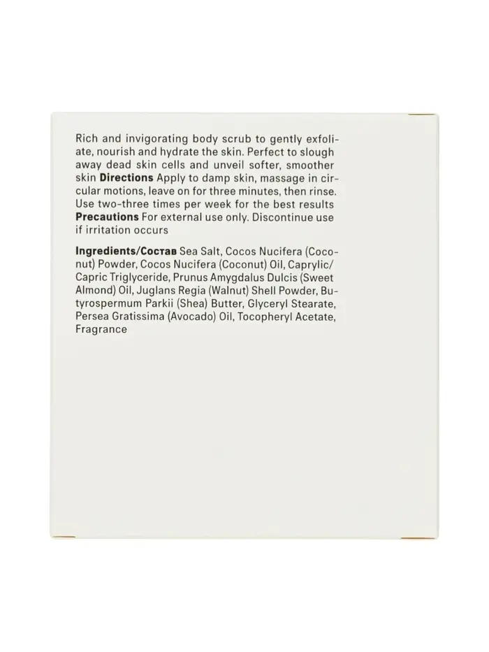 Морская соль, кокосовая мука, масло кокоса, каприлик/каприловый триглицерид, масло сладкого миндаля, абразив скорлупы грецкого ореха, масло ши, глицерил стеарат, масло авокадо, витамин E, отдушка.