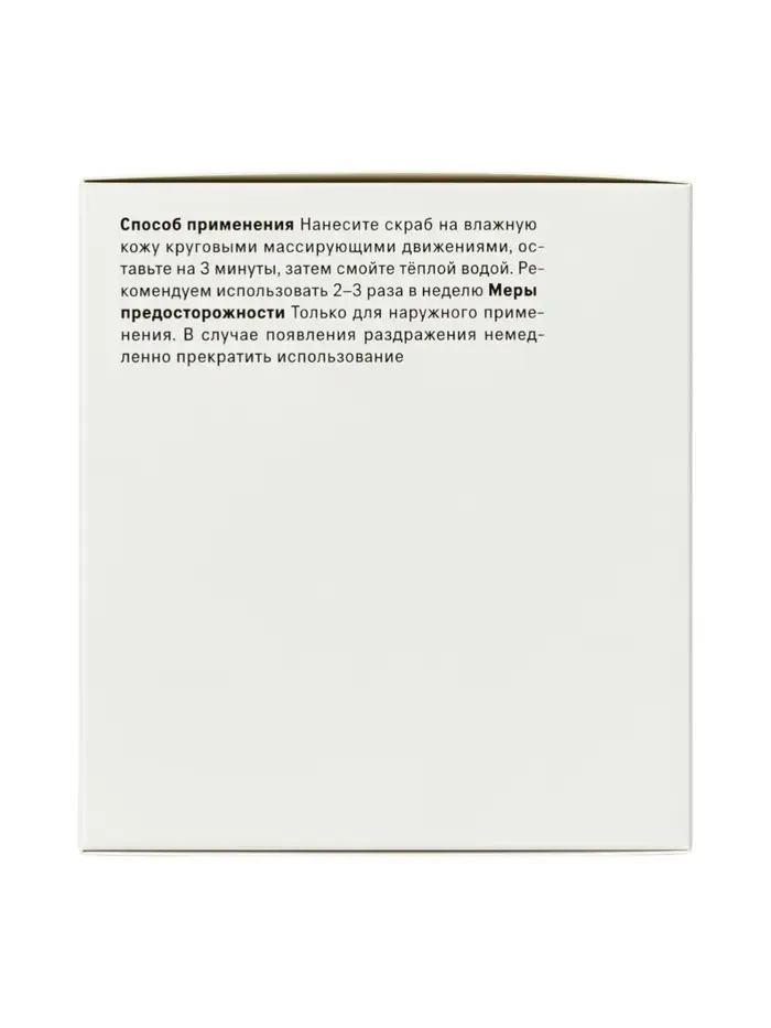 Нанесите скраб на влажную кожу круговыми массирующими движениями, оставьте на 3 минуты, затем смойте тёплой водой. Рекомендуется использовать 2–3 раза в неделю.