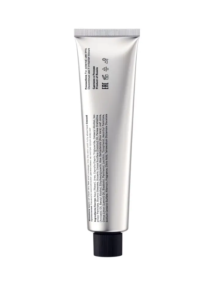 Вода, мочевина, каприлик/каприк триглицерид, цетеариловый спирт, кокосовое масло, глицерил стеарат, коко-каприлат/капрат, масло авокадо, сок алоэ вера, масло лимона, бисаболол, пантенол, натрия цетил сульфат, аллантоин, отдушка, лимонная кислота, тетранатрия глутамата диацетат, бензиловый спирт, этилгексилглицерин.