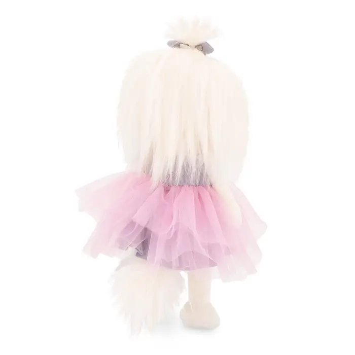 Мягкая игрушка «Стильная собачка в юбке» создана в нежном и романтичном образе. Длинная белоснежная шерсть, аккуратный бантик на голове и пышная розовая юбка из фатина формируют утончённый персонаж, который сразу притягивает взгляд. Надпись LOVE на платье добавляет образу лёгкий модный акцент и делает игрушку особенно выразительной.