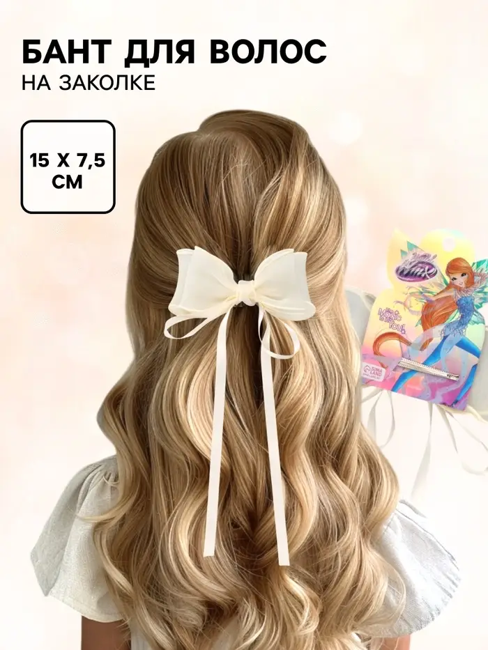 Бантик для волос с пышными лентами на прочной заколке. Элегантный аксессуар с изображением персонажа мультфильма в стиле принцесс. Создает волшебные образы для повседневных прогулок и праздников. Мягкая фиксация, безопасный материал, не спутывает волосы. Идеальный подарок для юных модниц.