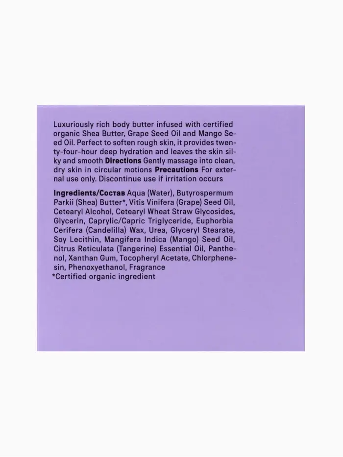 Вода, баттер ши, масло виноградной косточки, цетеариловый спирт, пшеничный эмульгирующий воск, глицерин, каприлик/каприк триглицериды, канделильский воск, мочевина, глицерил стеарат, соевый лецитин, масло семян манго, эфирное масло мандарина, пантенол, ксантановая камедь, токоферил ацетат, хлорфенезин, феноксиэтанол, отдушка