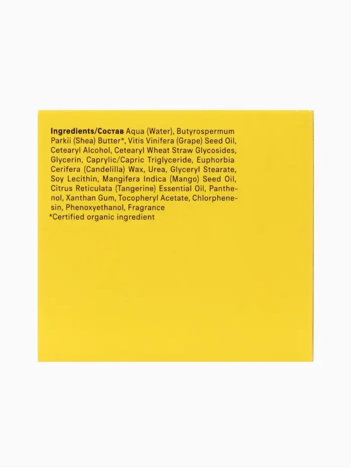 Вода, баттер ши, масло виноградной косточки, цетеариловый спирт, пшеничный эмульгирующий воск, глицерин, каприлик/каприк триглицериды, канделильский воск, мочевина, глицерил стеарат, соевый лецитин, масло семян манго, эфирное масло мандарина, пантенол, ксантановая камедь, токоферил ацетат, хлорфенезин, феноксиэтанол, отдушка