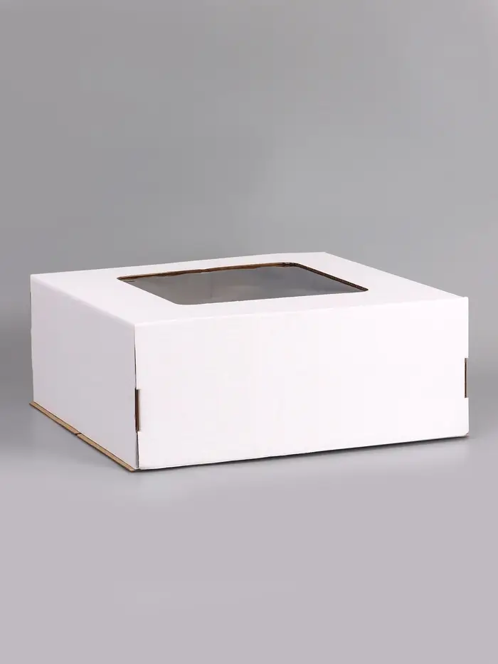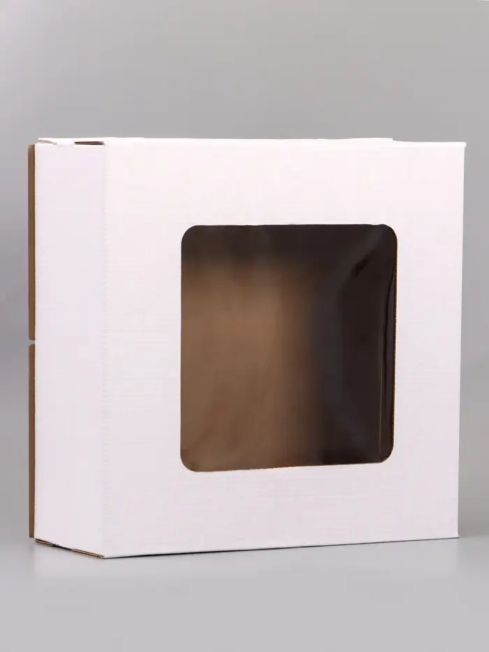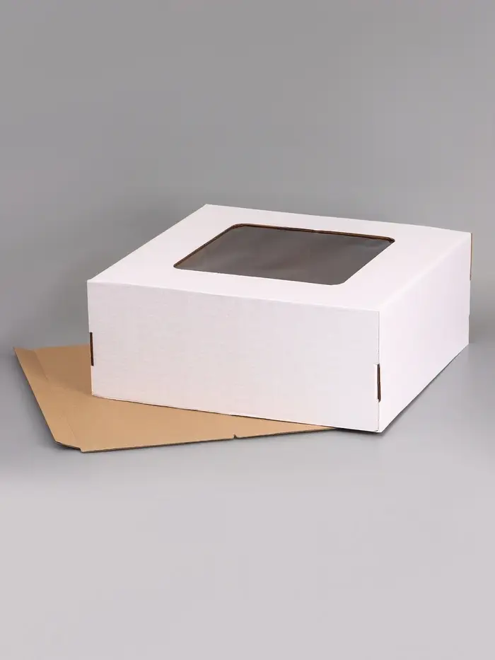 - Надежная защита и презентация: Плотный белый картон (420 г/м²) обеспечивает жесткость стенок, предотвращая сминание и деформацию торта при переноске. Окно из прозрачной пленки позволяет видеть изделие, не открывая коробку.