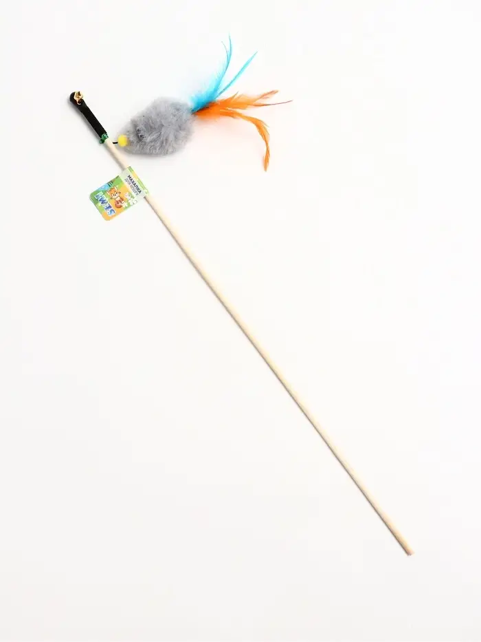 Дразнилка - удочка "Мышка с колокольчиком и перьями" на деревянной палочке, серая