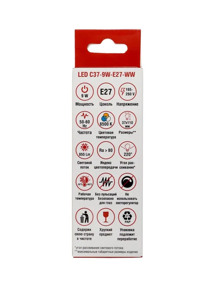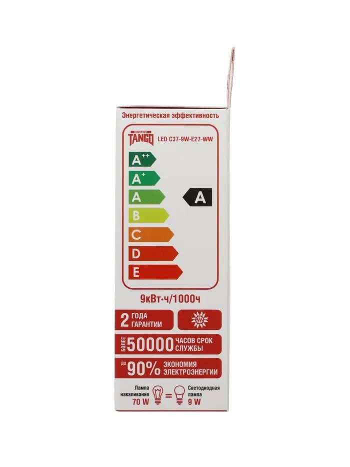 Лампа светодиодная TANGO, С37, 9 Вт, E27, 855 Лм, 6500K, IP20, свечение холодное белое, матовое стек