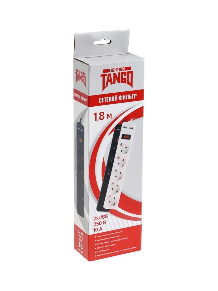 Сетевой фильтр TANGO, 5 гнезд с 2×USB, 1,8м, 10 А, 2200 Вт, с з/к, черный