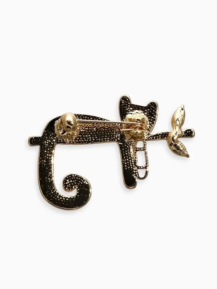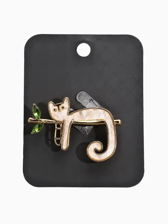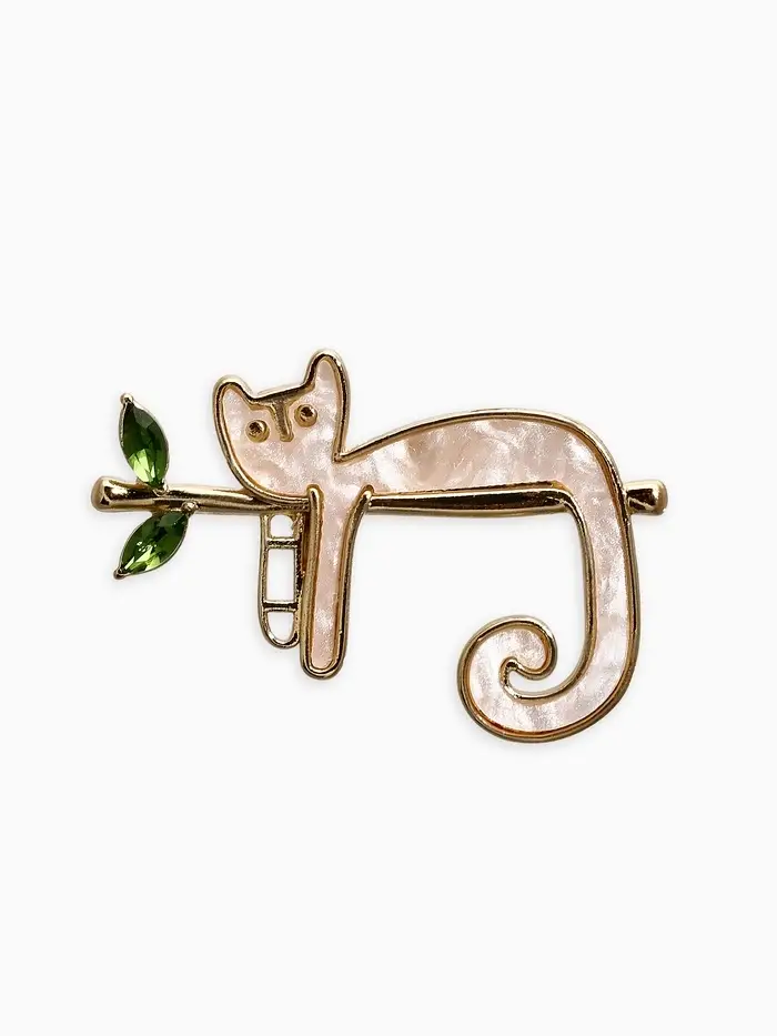 Брошь перламутровый "Котёнок" на ветке, цвет белый в золоте